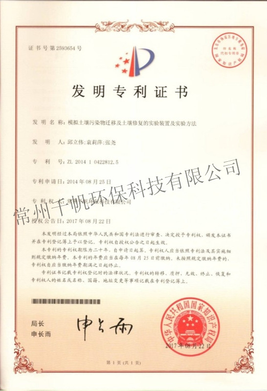 发明专利证书 模拟土壤污染物迁移及土壤修复的实验装置及实验方法